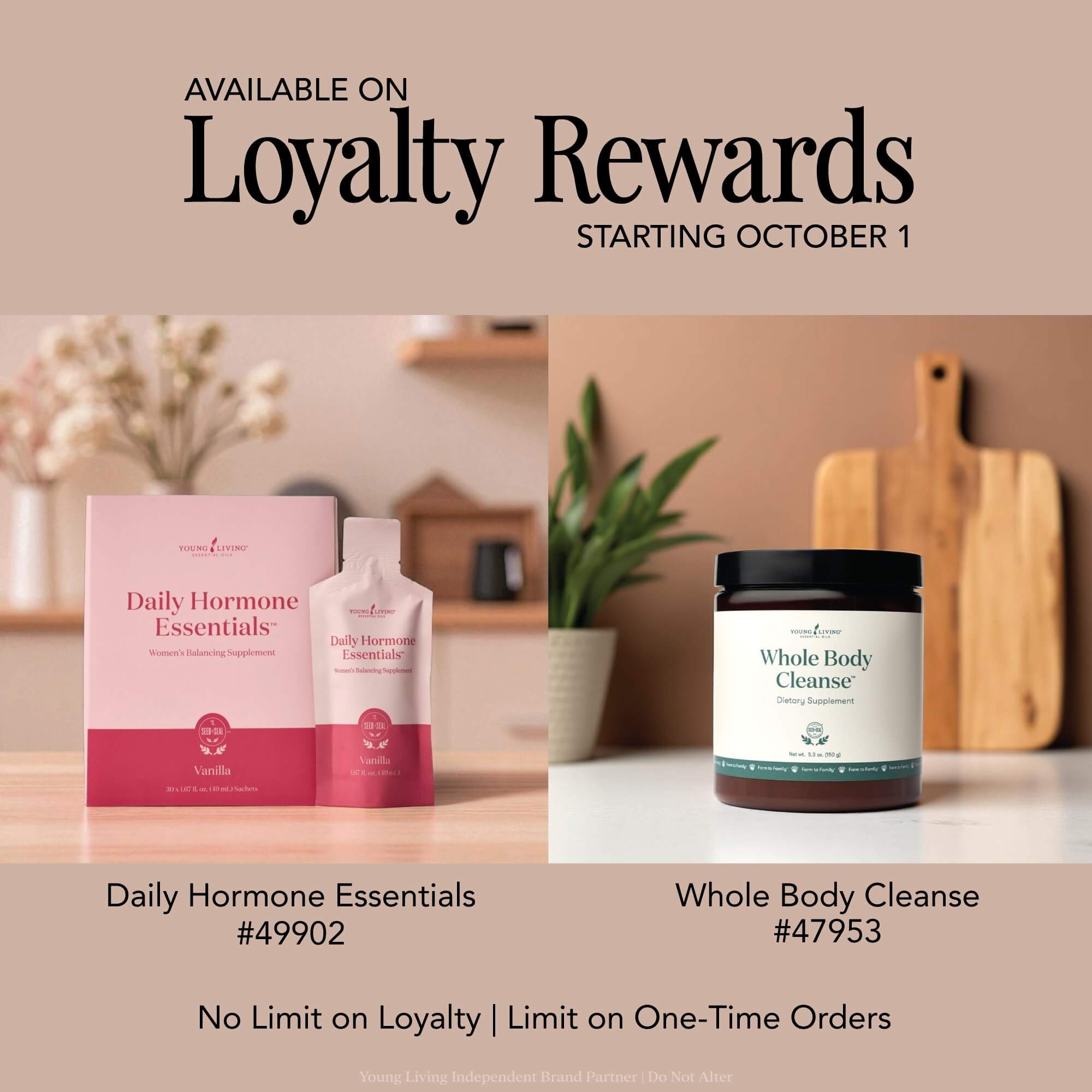AND - NEWS FLASH - DAILY HORMONE ESSENTIALS (DHE) and WHOLE BODY CLEANSE are available on Loyalty orders starting October 1st!! Unlimited ordering on Loyalty, limited on One-Time orders.